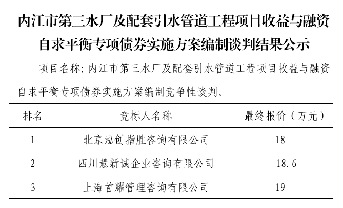內(nèi)江市第三水廠及配套引水管道工程項目收益與融資自求平衡專項債券實(shí)施方案編制談判結(jié)果公示