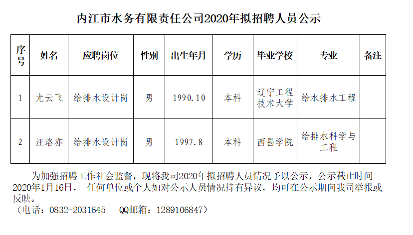 內(nèi)江市水務有限責任公司2020年擬招聘人員公示