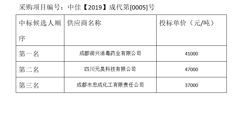 內(nèi)江市污水處理有限責(zé)任公司碳源補(bǔ)充劑和輔助消毒劑招標(biāo)項(xiàng)目(第2包)評標(biāo)結(jié)果公示