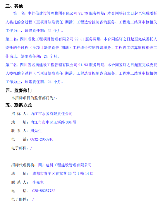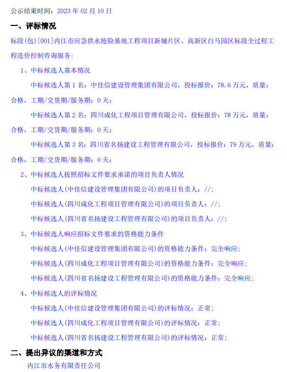 內(nèi)江市應(yīng)急供水搶險基地工程項目新城片區(qū)、高新區(qū)白馬園區(qū)標段全過程工程造價控制咨詢服務(wù)中標候選人公示