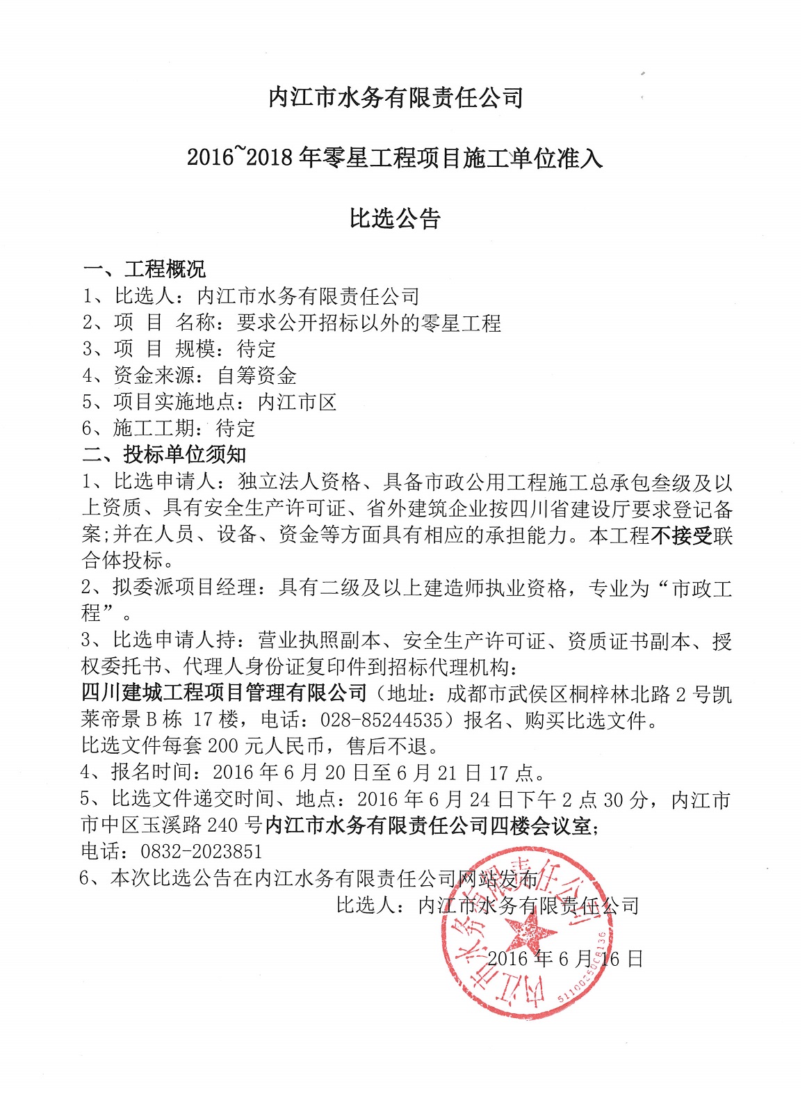內(nèi)江市水務(wù)有限責任公司2016~2018年零星工程項目施工單位準入比選公告