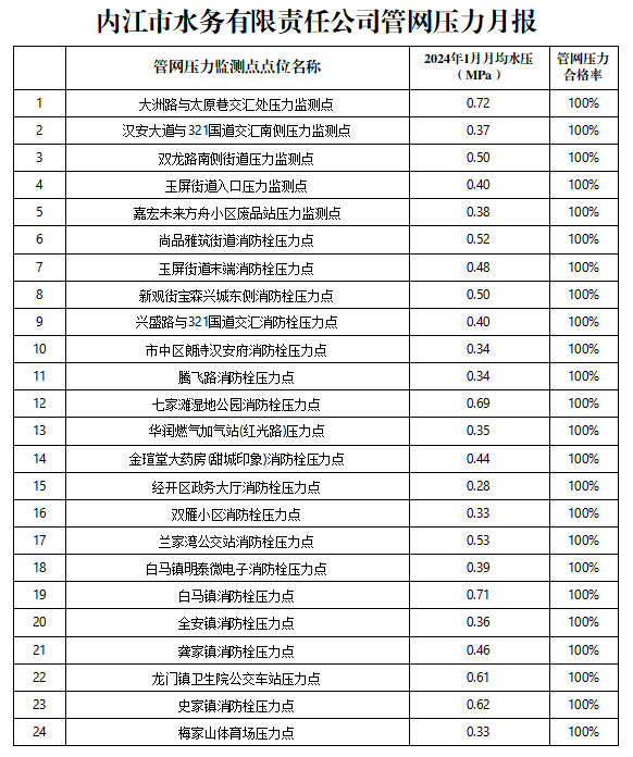 內(nèi)江市水務(wù)有限責(zé)任公司2024年1月管網(wǎng)壓力月報