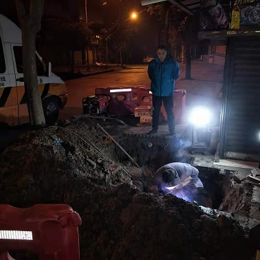 2月2日晚8點(diǎn)40分,接到市民報漏電話,位于晏家灣車站外的供水主管爆裂,部門立即組織人員趕往現(xiàn)場。經(jīng)查看確認(rèn)為一根DN150供水主管破裂,為了保障居民的正常用水,搶修人員連夜冒雨對供水管道進(jìn)行搶修,經(jīng)過5個小時的搶險作業(yè),于次日凌晨1點(diǎn)完成搶修任務(wù),保障了該區(qū)域居民正常用水。