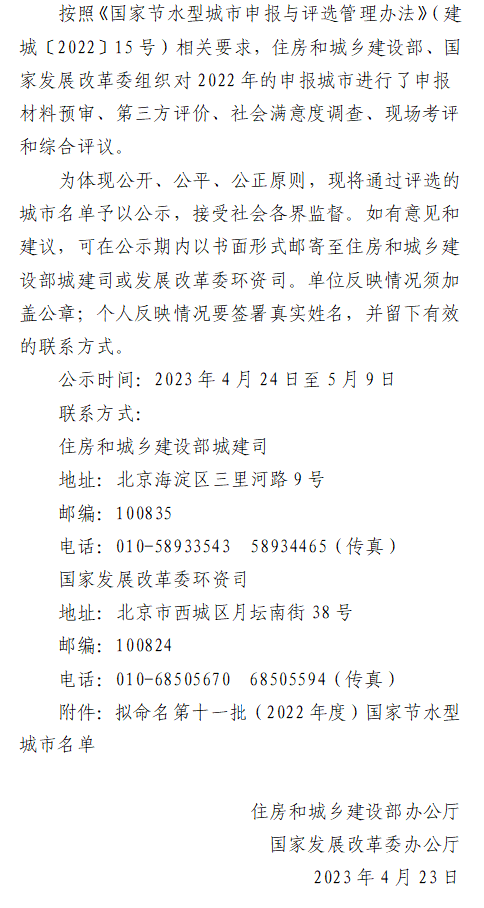 關(guān)于擬命名第十一批(2022年度) 國家節(jié)水型城市的公示