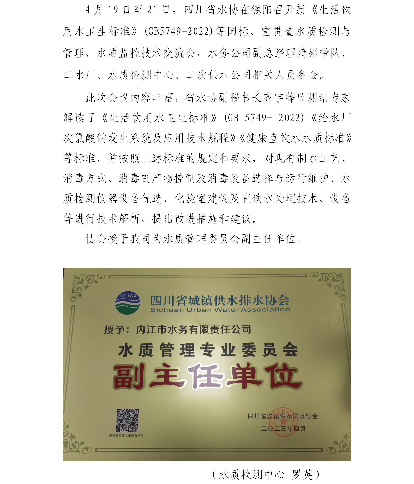 內(nèi)江市水務(wù)公司獲省水協(xié)授予水質(zhì)管理專業(yè)委員會副主任單位